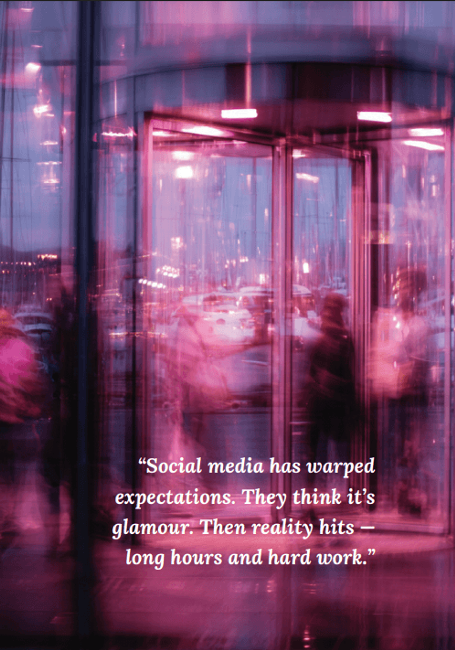 “Social media has warped expectations. They think it’s glamour. Then reality hits — long hours and hard work.”