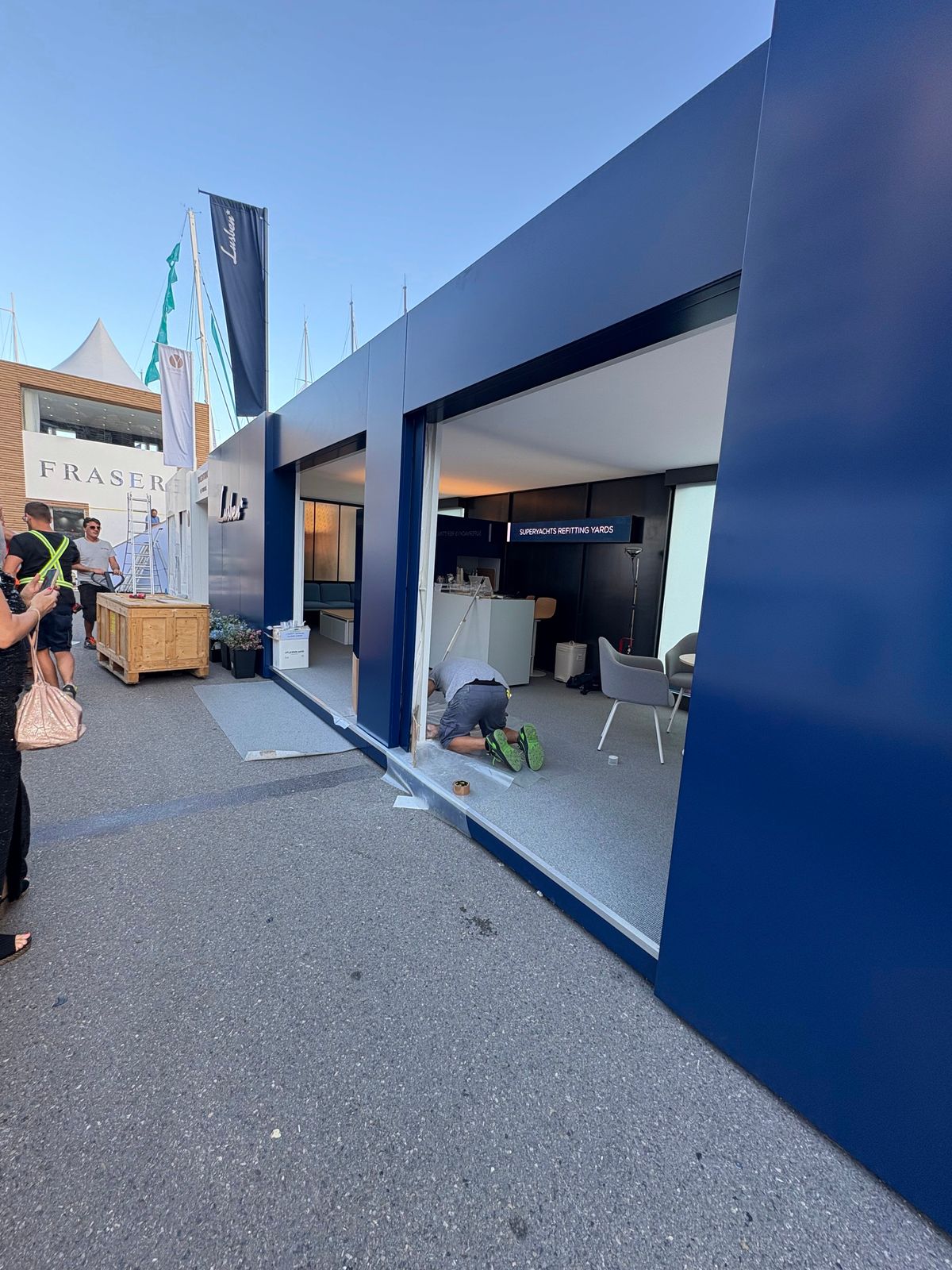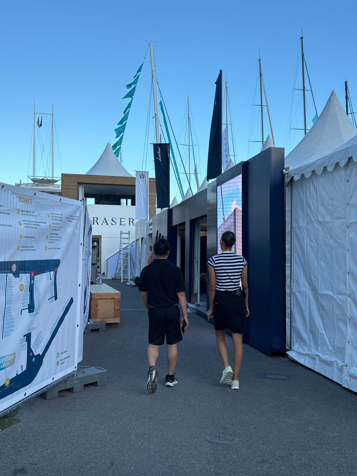 From late August, Port Hercule is progressively reconfigured. Clear-span marquees, steel-ballasted pontoons, and modular gangways are installed across the quays, with fire-rated fabrics and branded wraps ensuring both compliance and presentation standards. Zones are configured for technical focus — refit and equipment on Quai Albert Ier, services and the Sustainability Hub on Darse Sud, tenders and toys on Quai Antoine Ier, with the Upper Deck Lounge reserved for VIP hospitality.